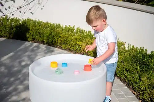 Een eenvoudig speelgoed voor de vroege bouw dat gemakkelijk vast te pakken, te knijpen, te nestelen, te stapelen, te bouwen en te balanceren is. De basis bevat tussen de 1 en 7 gaten om te tellen of te gieten, en een verhoogde cirkelrand voor tactiele verkenning. Kan ook worden gebruikt om in het water te spelen of om in verf of speeldeeg te stempelen.